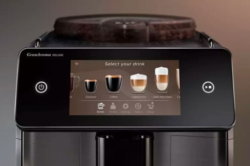 Zaawansowany kolorowy wyświetlacz o przekątnej 5 cali i wysokiej rozdzielczości jest wyposażony w intuicyjny interfejs użytkownika z ekranem dotykowym, który umożliwia wybór ustawień kawy.