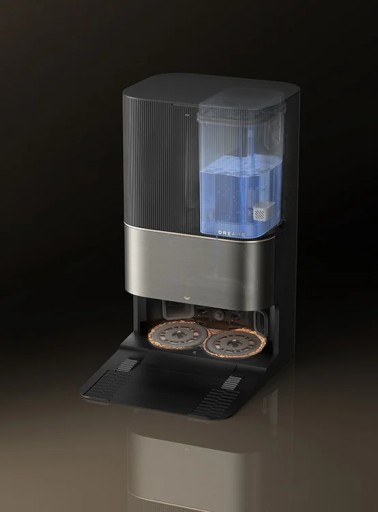 Stacja zapewnia ładowanie urządzenia, a także dba o uzupełnianie detergentu oraz dokładne suszenie mopa, zapewniając pełną gotowość do kolejnego cyklu sprzątania.
